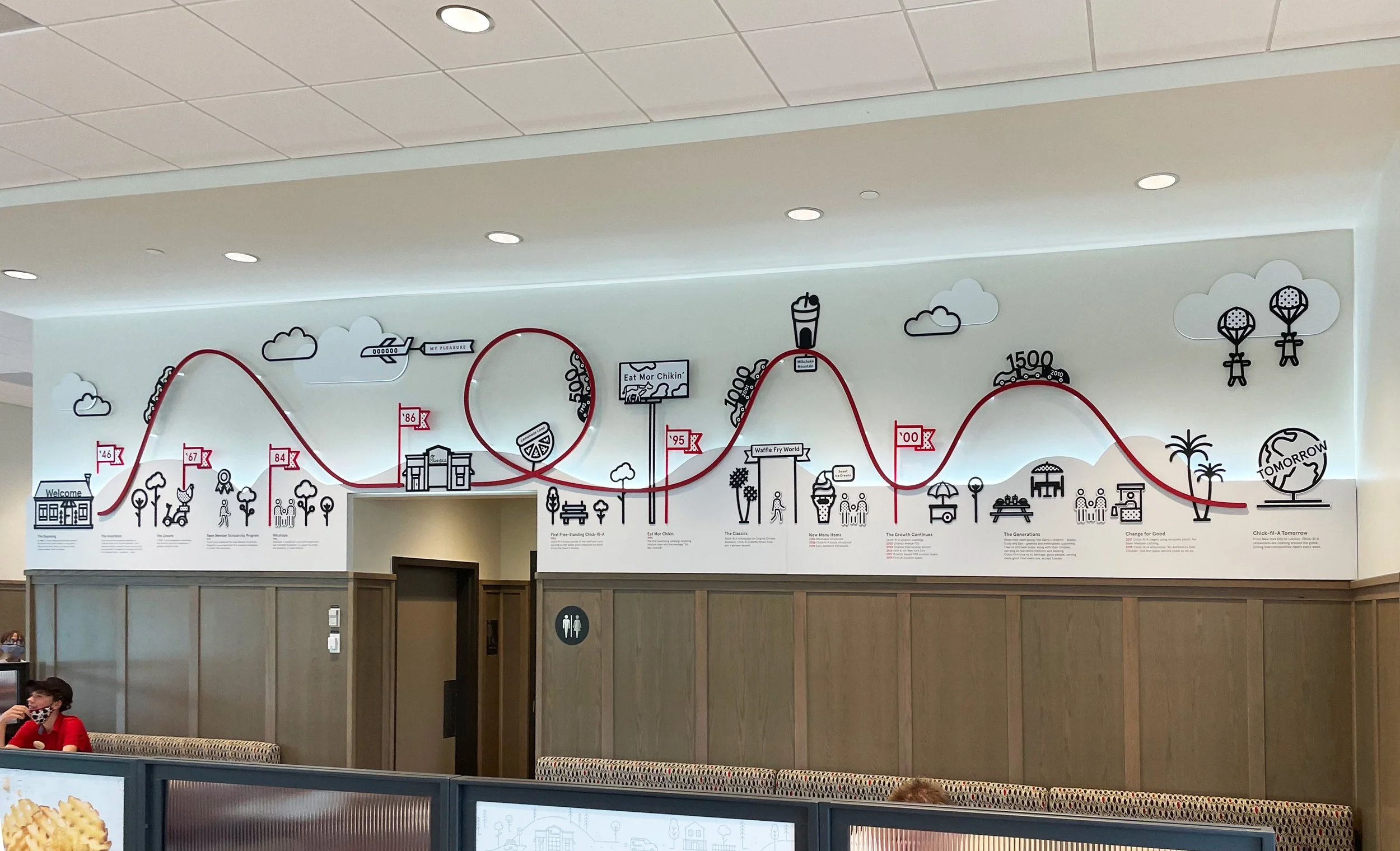When a new Chick-fil-A opened right next to Universal Studios theme park in Orlando, Florida, the team at Sense Makery and I were tasked with creating custom environmental installations to enhance the storytelling inside the restaurant. Drawing inspiration from the restaurant’s unique location, we designed an iconic roller coaster timeline that takes customers on a visual journey through Chick-fil-A’s history. On the next wall, we created a movie theater inspired poster gallery, featuring beloved menu items starring in their very own films. Both executions took elements from Chick-fil-A’s visual identity system and reframed them in creative and playful ways to fit in the theme park capital.
